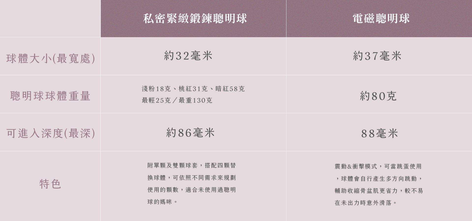 專為亞洲女生打造!大小適中的球體直徑約3.5公分,尺寸好上手無負擔,搭配一般的水性潤滑液即可輕鬆放入!一共有4顆球,分別為提供18g、31g、58g*2,三種不同重量球體去做搭配,最輕25g到最重130g,超廣範圍鍛鍊重量可循序漸進增加緊實度。