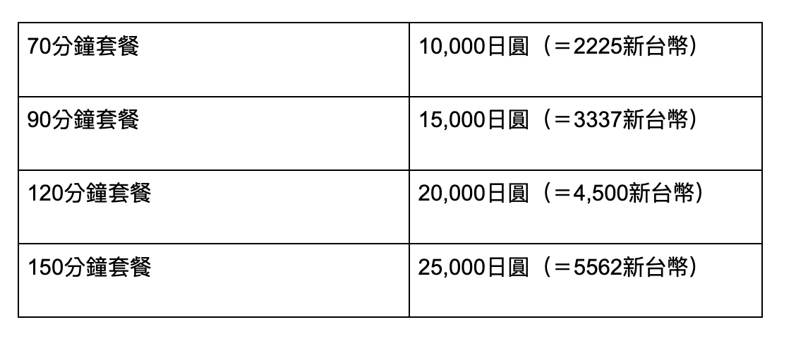 女性用風俗的價格因應套餐以及追加的項目而有所不同,最受歡迎的120分鐘套餐平均價格約為20,000日圓(=4,500新台幣)。以下是日本最有名的女性用風俗店「東京秘密基地」的價格表。